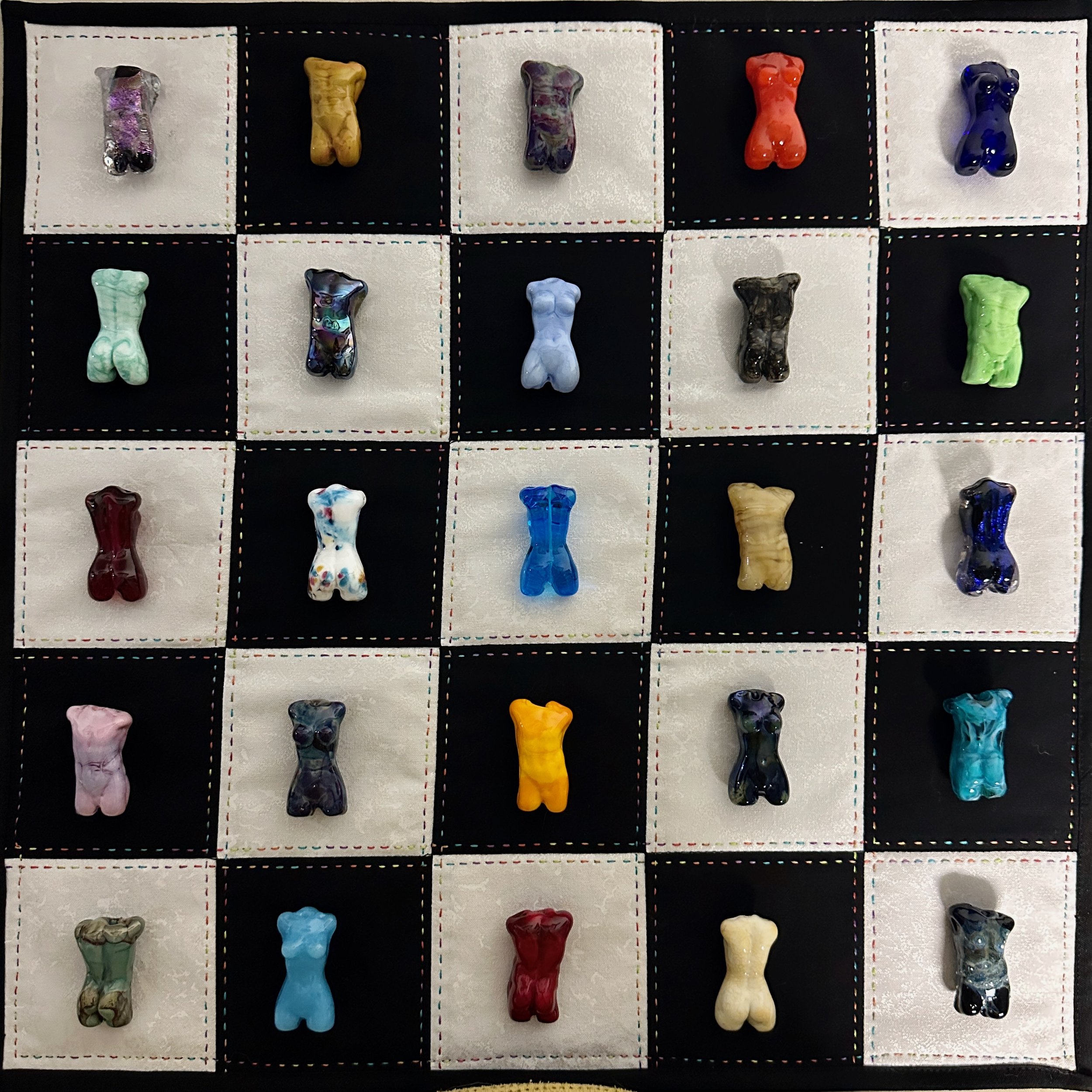 The first type includes works made from obvious discrete pieces: broken pieces, scraps, failed projects, and small pieces of glass from previous projects. What do you do with this glass “detritus”? You save it and get buried in it or make something out of it. There is even one work created on a “pieced” quilt (I also make quilts).
